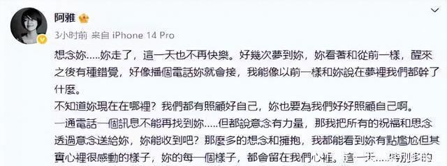 一通电话一个讯息不能再找到你…… 这已经不是阿雅第一次公开念旧。 自从大S离世之后,她的悼念从未流于形式。
